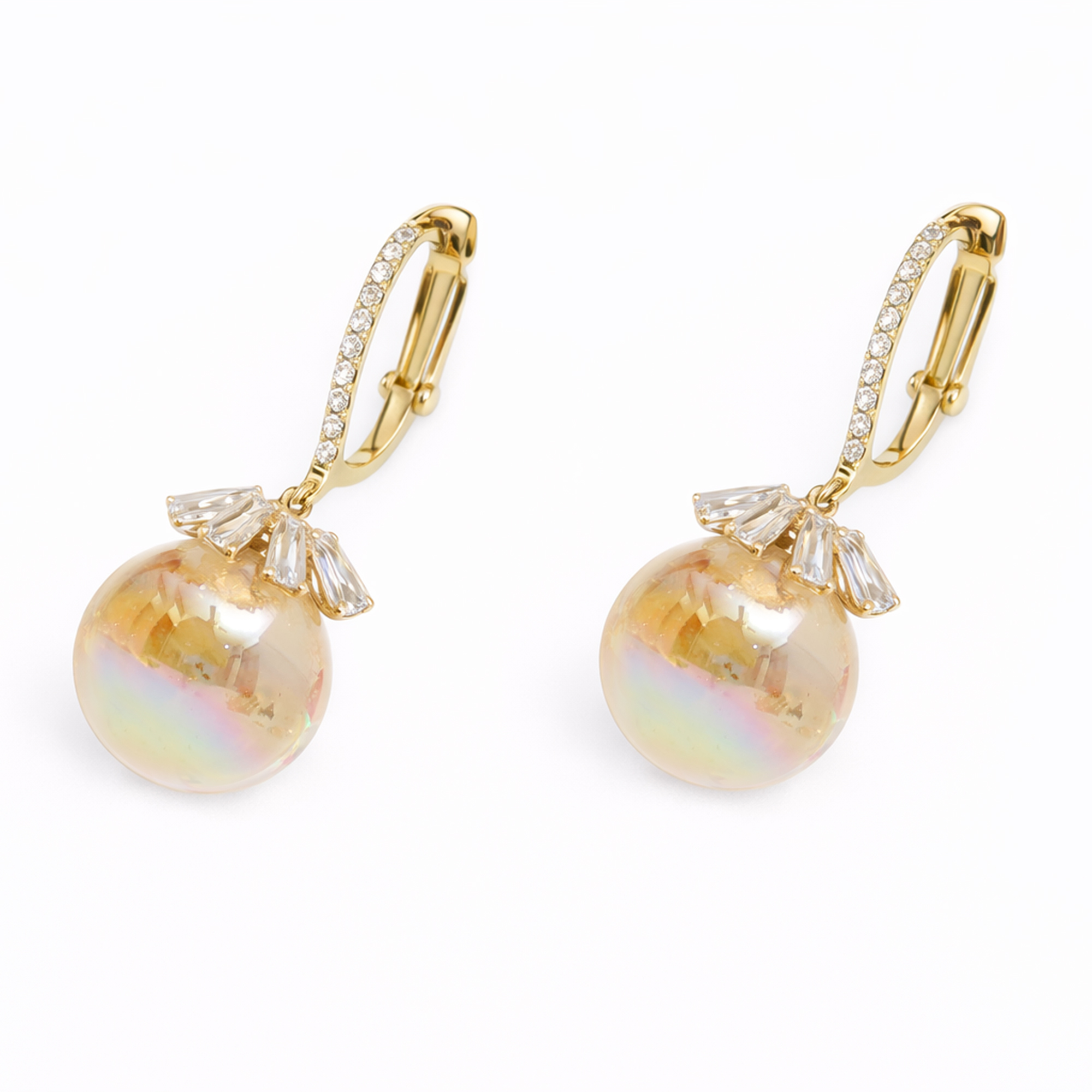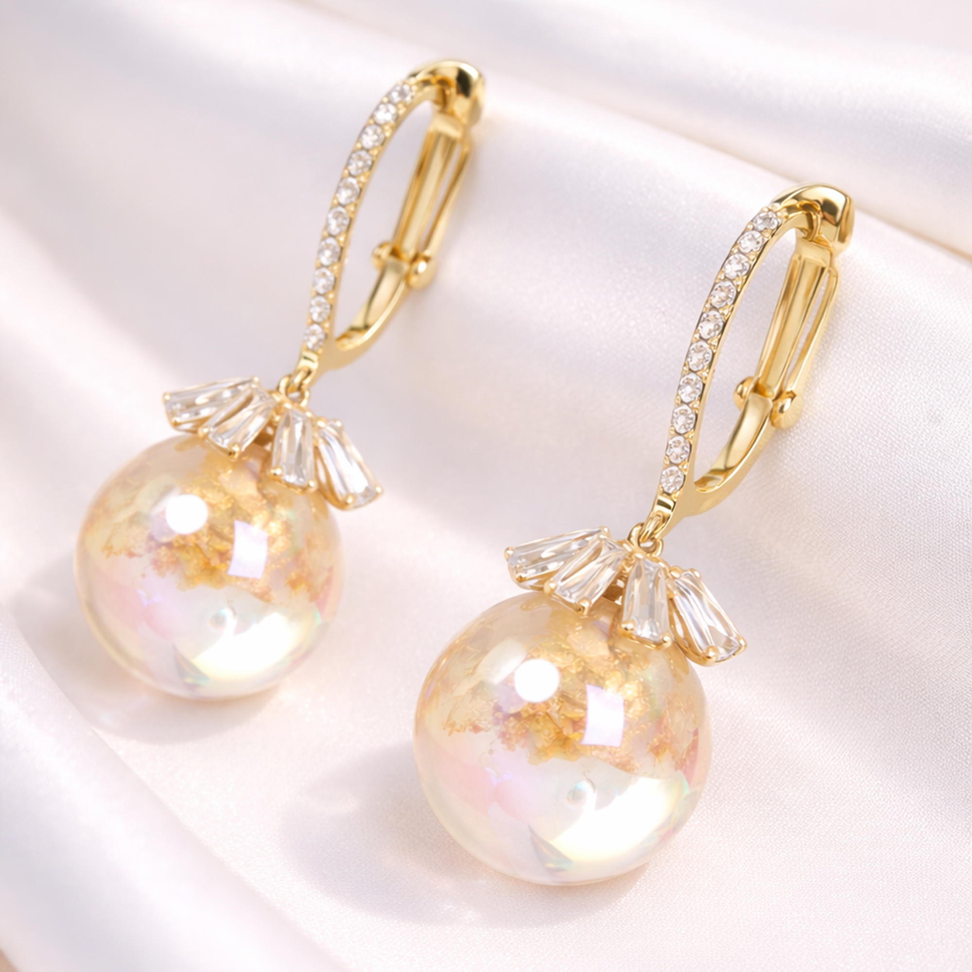 Snow Globe Drops β Artistic gold-finish earrings showcasing crystal-encrusted hoops and botanical-inspired spheres, designed for a bold, elegant, and effortlessly chic statement. πΏπ