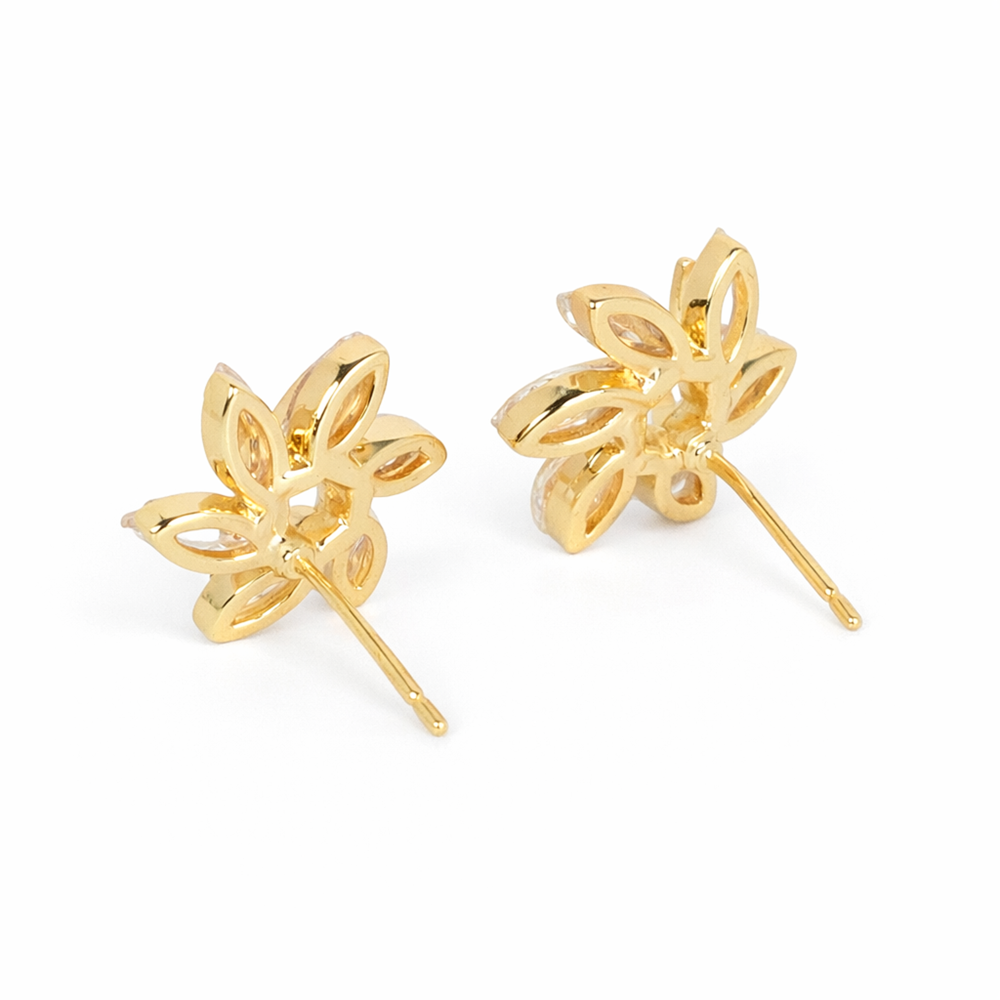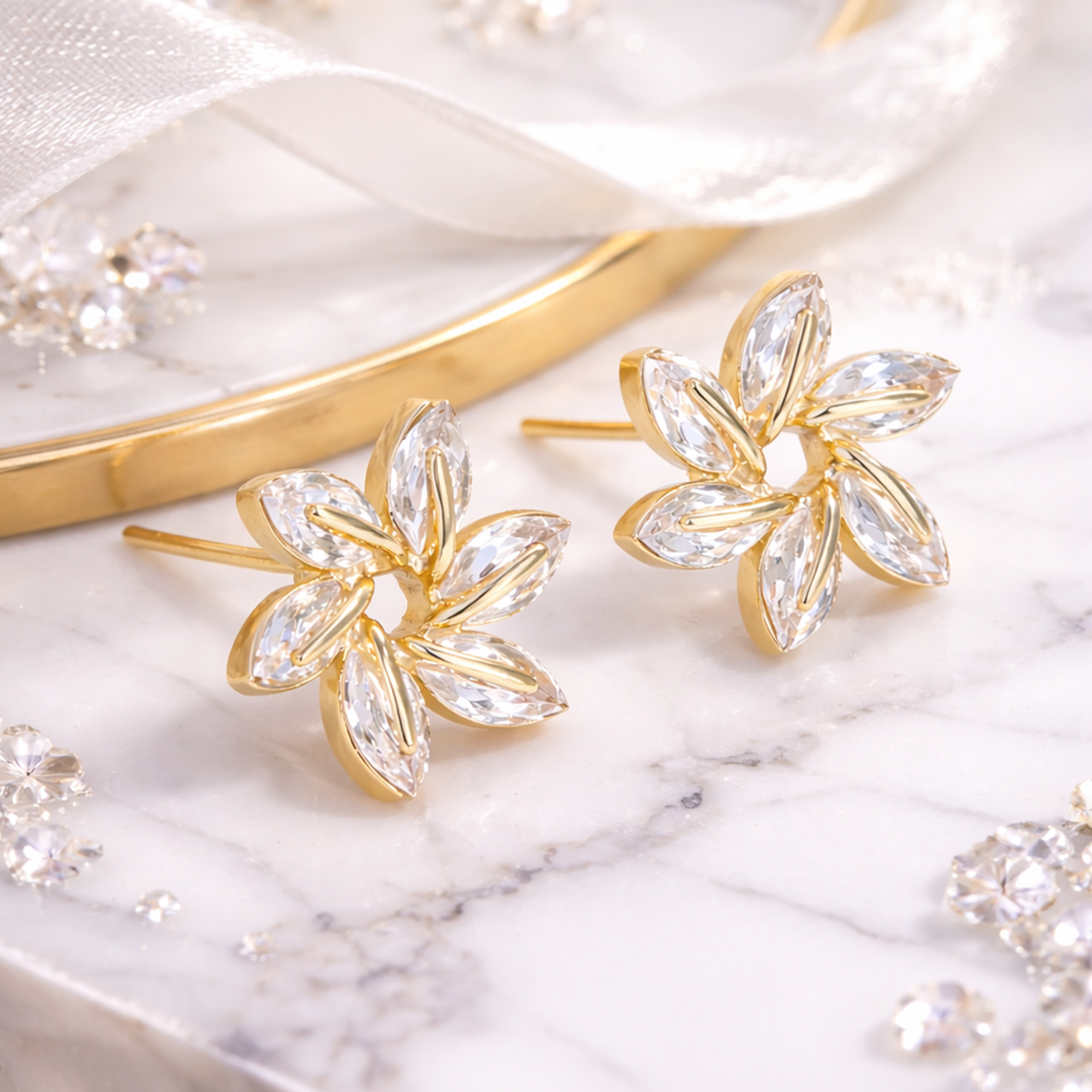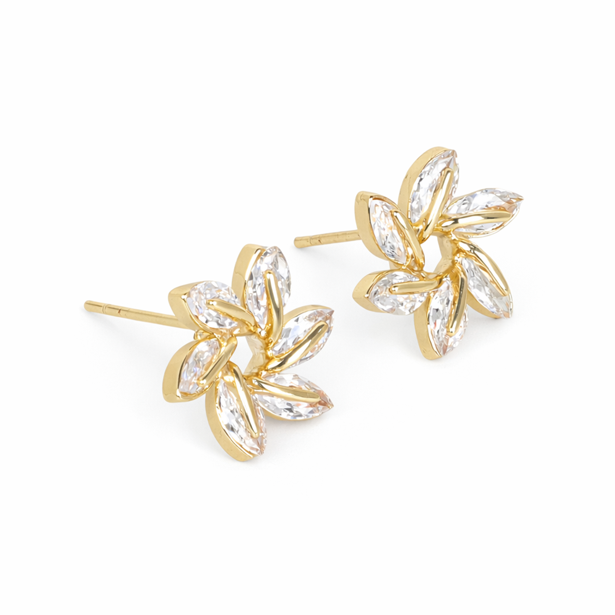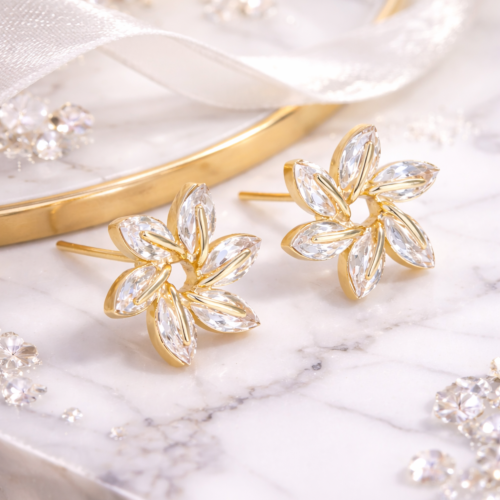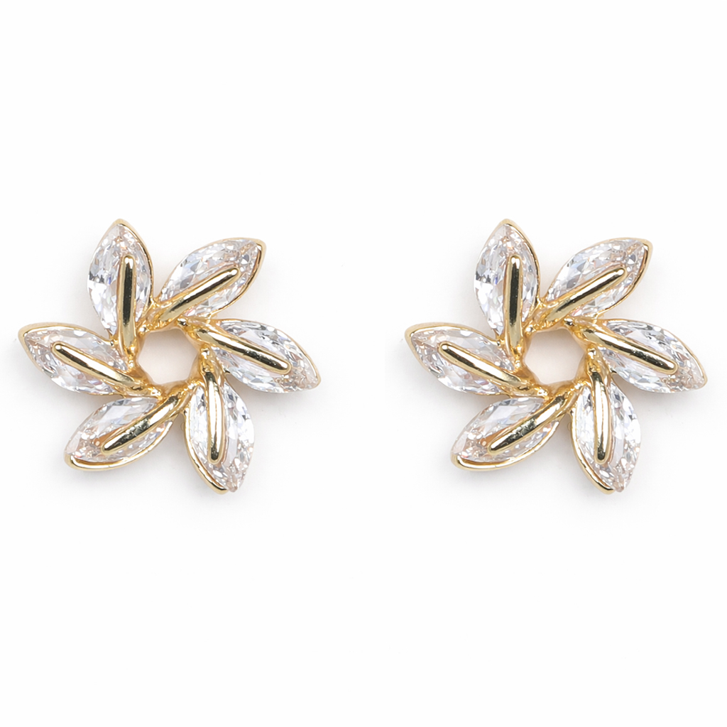 Swirl Earrings – Gold-finish floral earrings embellished with sparkling crystal stones, giving a soft swirl design that adds elegance to both daily and party wear. ✨🌸